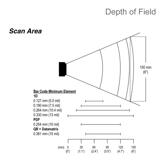 对0.33mm (13mil)的条码,景深为0mm - 152mm |